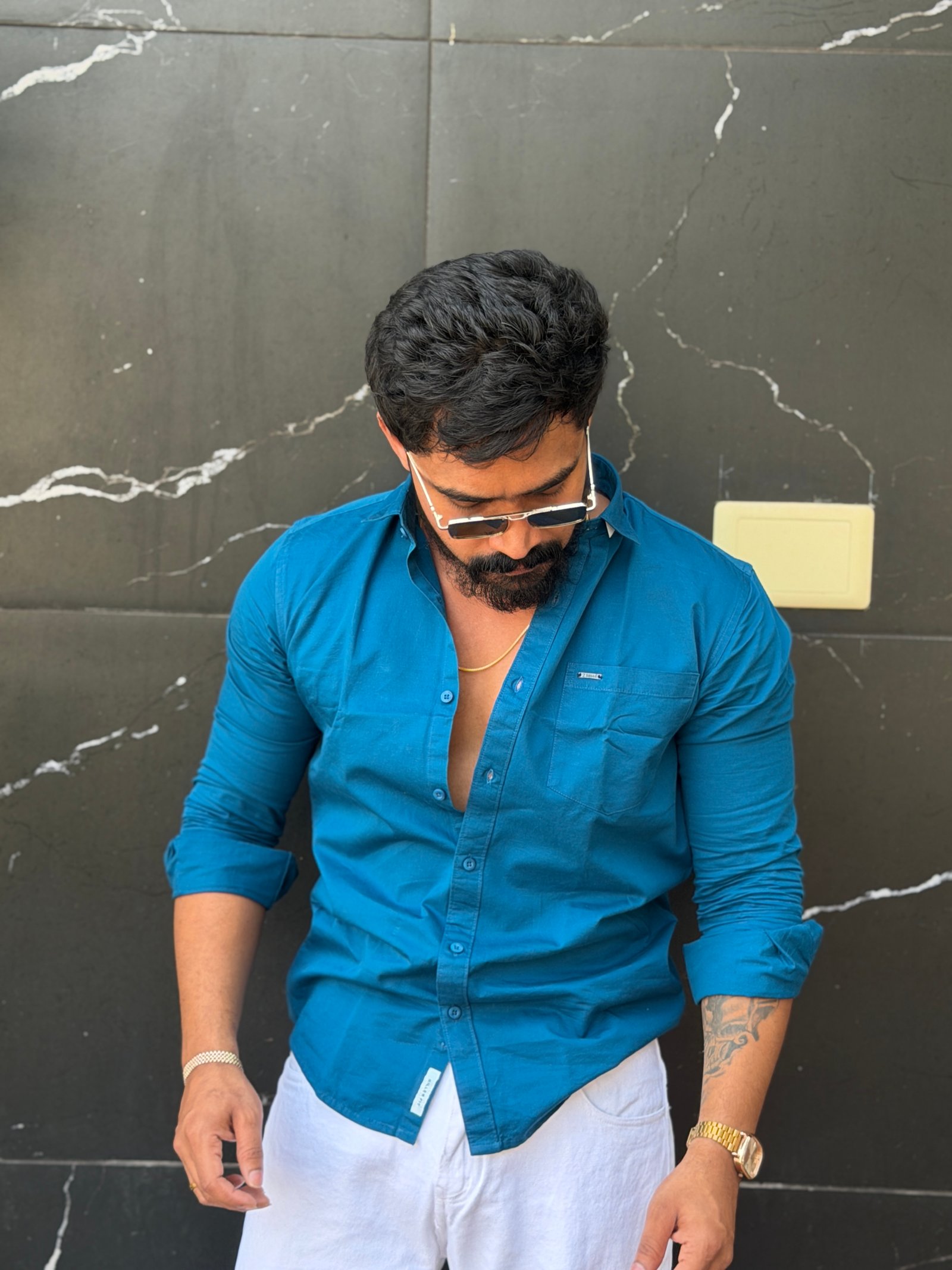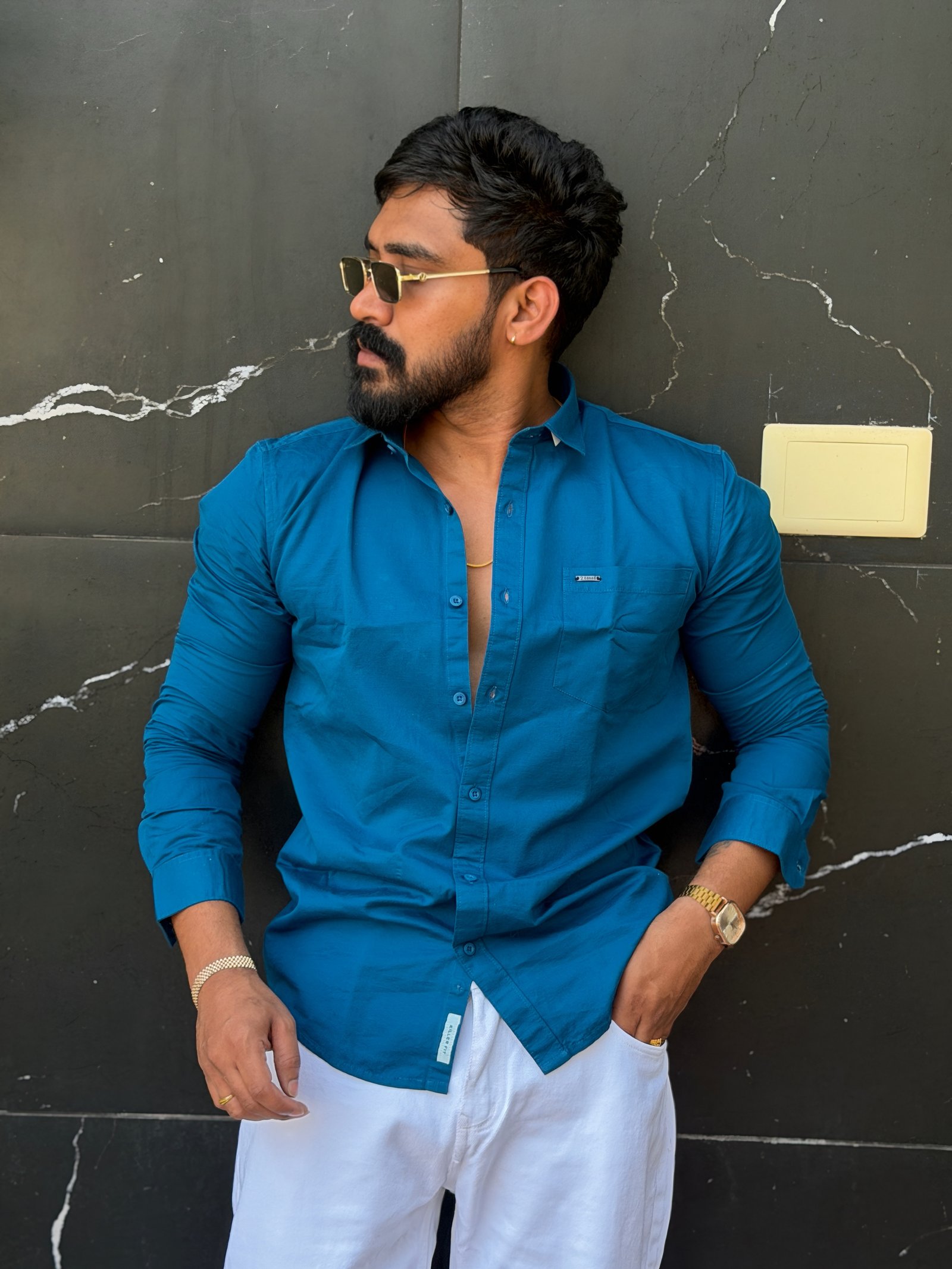 Turquoise Blue Plain Linen Full Sleev Shirt