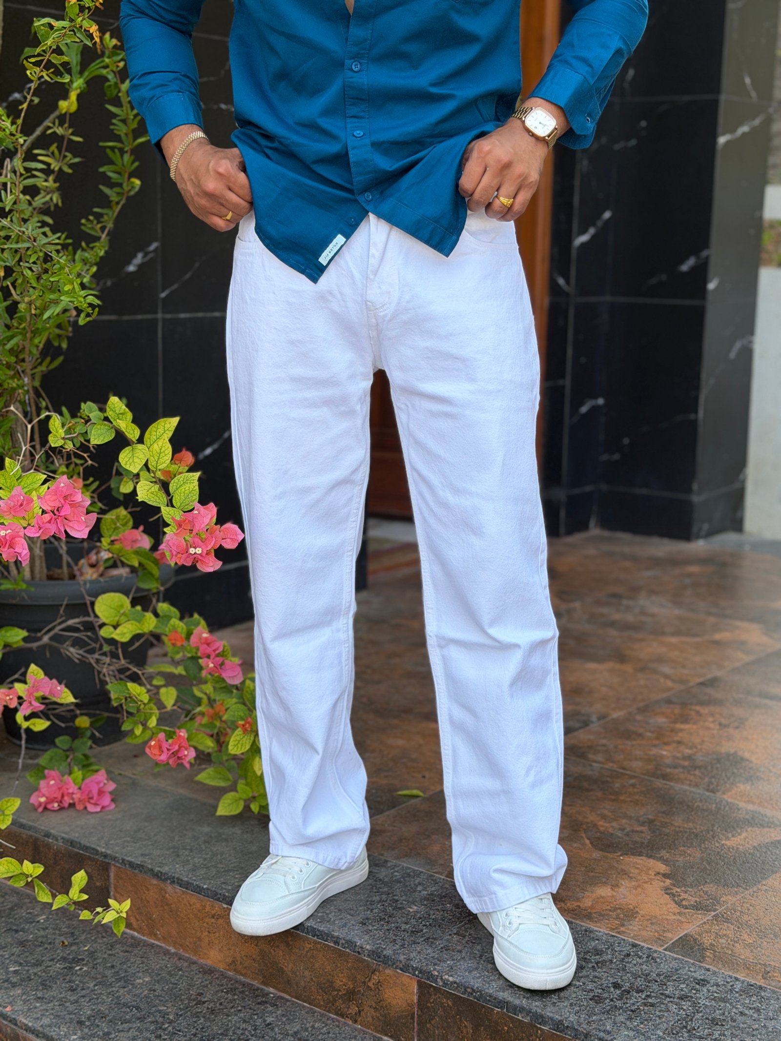 • Black fitted tee → strong contrast, bold & clean